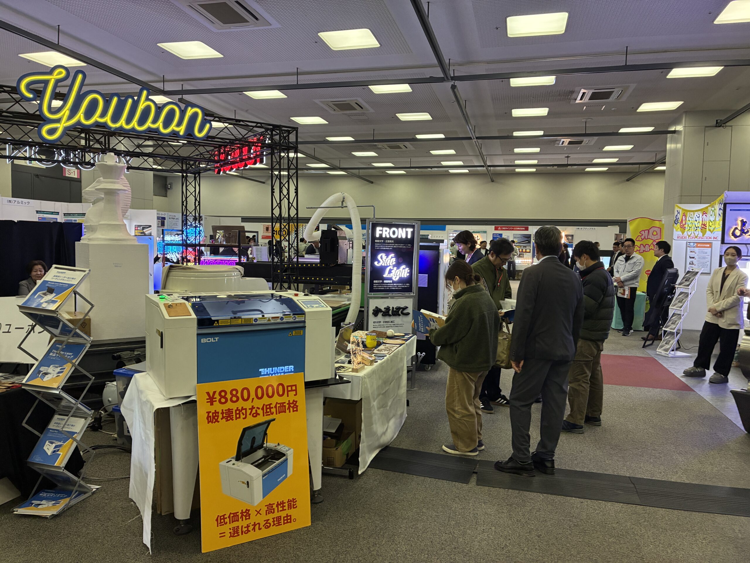 出展社は、組合員等の施工業者向けに機材等を販売する専門メーカーや商社が中心で、計74コマのブースに印刷機器やサイン関連照明など最新の資材・機材が集結。来場者は製品を確認しながら商談や技術確認を行いました。